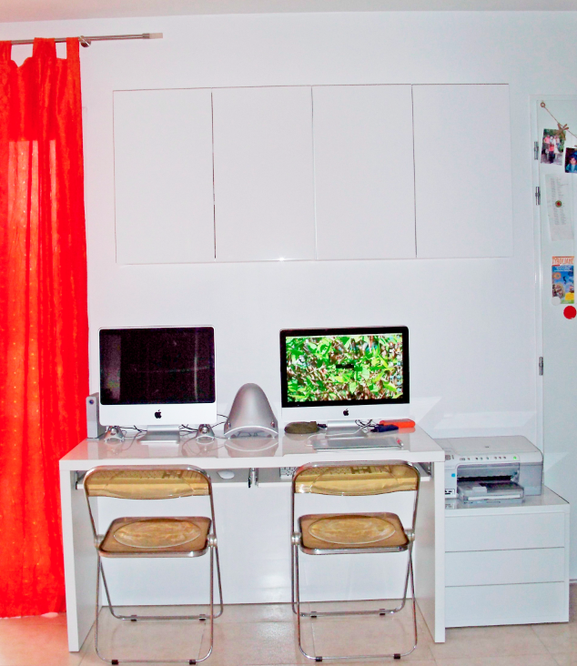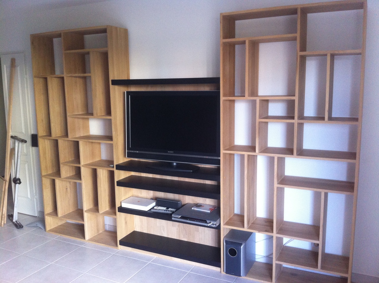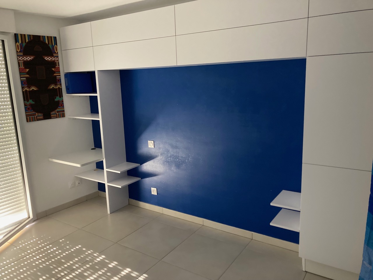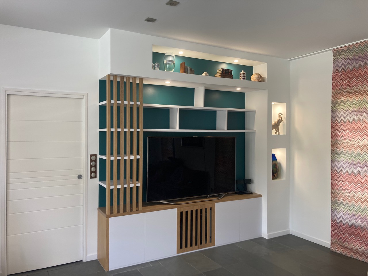 Descriptif : Mobilier et étagères de chez Alvic Center, plateau, jambage, porte ajourée et carrelets en chêne de Bourgogne. Design client, plâtrerie et peinture de Rémi Lefébvre (Valergues).